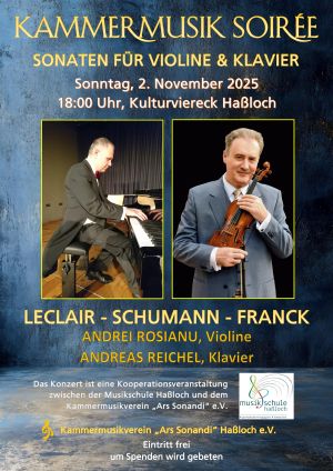 Nach seinem erfolgreichen Jubiläumskonzert im Oktober anlässlich seines 30-jährigen Jubiläums als 1. Konzertmeister des Nationaltheaters Mannheim kehrt Andrei Rosianu erneut nach Haßloch zurück. Gemeinsam mit dem Pianisten Andreas Reichel, der an der Musikschule Haßloch unterrichtet und dort auch als Fachbereichsleiter tätig ist, präsentiert er ein abwechslungsreiches Programm mit Werken von Jean-Marie Leclair, Robert Schumann und César Franck.