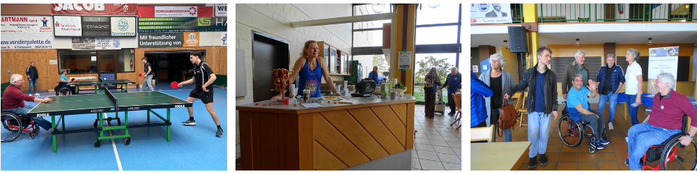 Vorbei an einem Infotisch des Behindertenbeirats und der Außentheke der TSG mit Speis und Trank, ging es in die große Sporthalle. Gerade bei den Kindern stieß dort der vom Landessportbund zur Verfügung gestellte Rollstuhlparcours auf großes Interesse und die kleinen Rollstühle wurden – in diesem Fall als Sportgerät – gerne genutzt. Die Tischtennisabteilung der TSG stellte vier Tischtennisplatten auf, an denen die jungen Sportler auch gerne mal z. B. gegen Rollstuhlfahrer antraten. Auch für diese Gruppe ist Tischtennis durchaus geeignet.