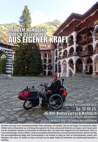 Ein halbes Jahr lang war Robin Kaltenbach mit Handbike, Zelt und viel Neugier unterwegs – von Deutschland über Österreich und Ungarn bis nach Rumänien, Bulgarien und Griechenland. Dabei erlebte er nicht nur beeindruckende Landschaften und Tierbegegnungen, sondern auch viele herzliche Begegnungen mit Menschen entlang der Strecke.