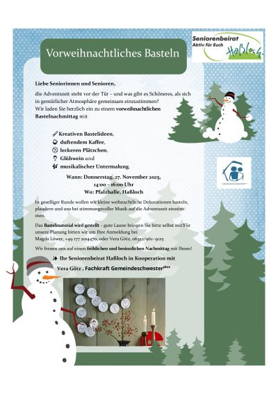 Der Seniorenbeirat Haßloch lädt gemeinsam mit Vera Götz, Fachkraft Gemeindeschwesterplus, zu einem gemütlichen Bastelnachmittag in der Adventszeit ein.