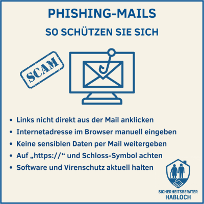 - Überprüfen Sie die Internetadresse in der Browserzeile. Öffnen Sie Links niemals direkt aus einer E-Mail heraus, sondern rufen Sie die Internetseite des Anbieters manuell auf.