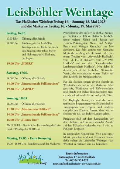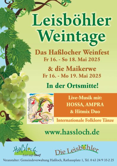 Die Leisböhler Weintage und die Haßlocher Maikerwe sind ein fester Bestandteil des Veranstaltungskalenders in Haßloch. Mit einer gelungenen Kombination aus Pfälzer Weinkultur, stimmungsvoller Musik und klassischem Kerwe-Treiben laden sie zum Genießen, Verweilen und Feiern ein.