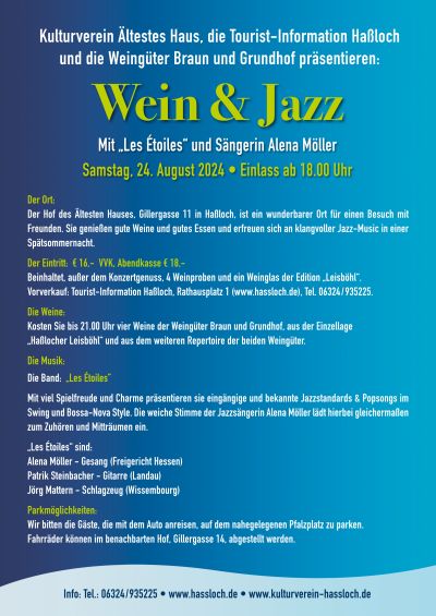 Im wunderschönen Ambiente des historischen Hofes des „Ältesten Haus“, in der Gillergasse in Haßloch, ist der Abend mit „Wein & Jazz“ ganz dem Genießen gewidmet. Es laden ein der Kulturverein „Ältestes Haus“, die Leisböhler und die Tourist-Information Haßloch.