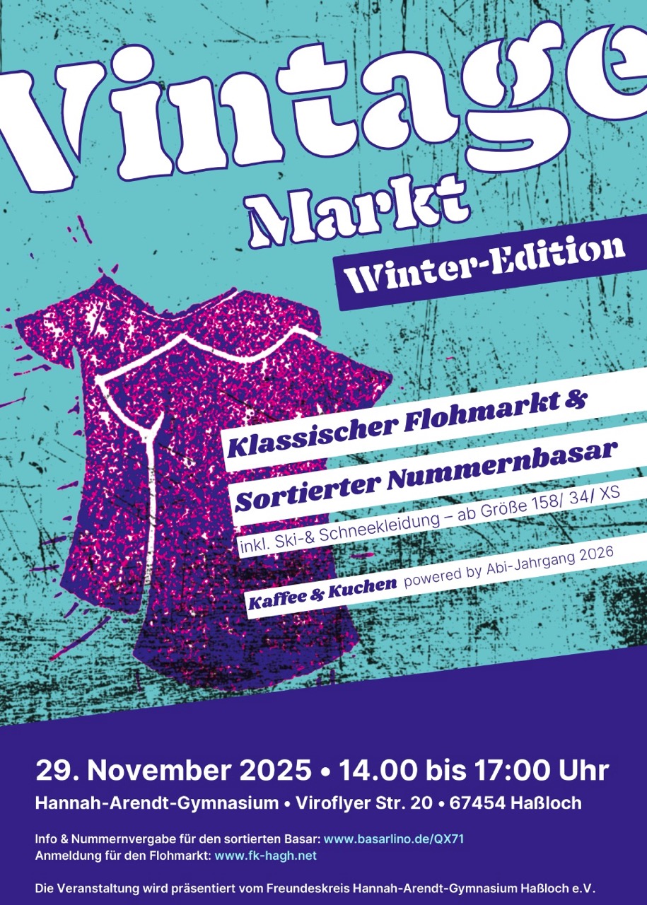 Samstag, 14:00 - 17:00 Uhr Markt, Vereine | Vintage Markt und Basar - Winter Edition Der Freundeskreis Hannah-Arendt-Gymnasium Haßloch e.V. präsentiert am 29. November 2025 seinen bekannten Basar zum zweiten Mal als „Vintage Markt“. Im neuen „Zwei in Eins“-Format findet neben dem klassischen Flohmarkt in der Aula zeitgleich in den angrenzenden Räumen ein sortierter Nummernbasar statt.