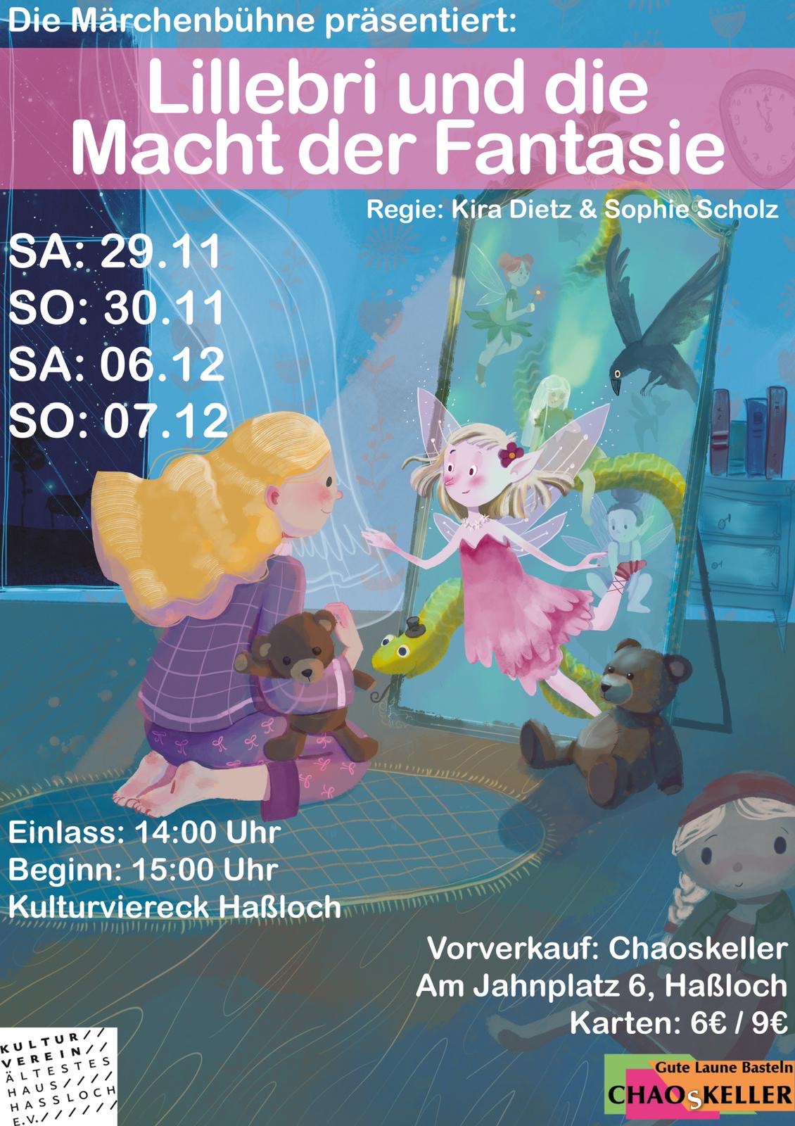Sonntag, 14:00 - 18:00 Uhr Sonstiges, Kultur, Vereine, Theater | Die Märchenbühne präsentiert: Lillebri und die Macht der Fantasie Was passiert, wenn Eltern und Erwachsene immer nur im Alltagsstress versinken und keine Zeit mehr für ihre Kinder haben, sieht man in diesem Märchen. Die Fantasie geht verloren. Doch Spielzeuge und Kuscheltiere sind weit aus lebendiger, als man glaubt. Sie wollen nicht in irgendeiner Kiste verstauben, weil keiner mehr Fantasie hat, um mit ihnen zu spielen und treten den "Kampf" an. Gemeinsam mit Nele stürzen sie sich ins Abenteuer, um am Ende den Erwachsenen ein Stückchen ihrer beim Erwachsenwerden verloren gegangen Fantasie zurückzugeben. Natürlich gibt es auch hier zwei "böse Gestalten", die durch die fehlende Fantasie immer mächtiger werden und gestoppt werden müssen. Doch dabei unterstützen tatkräftig die Elfen.....