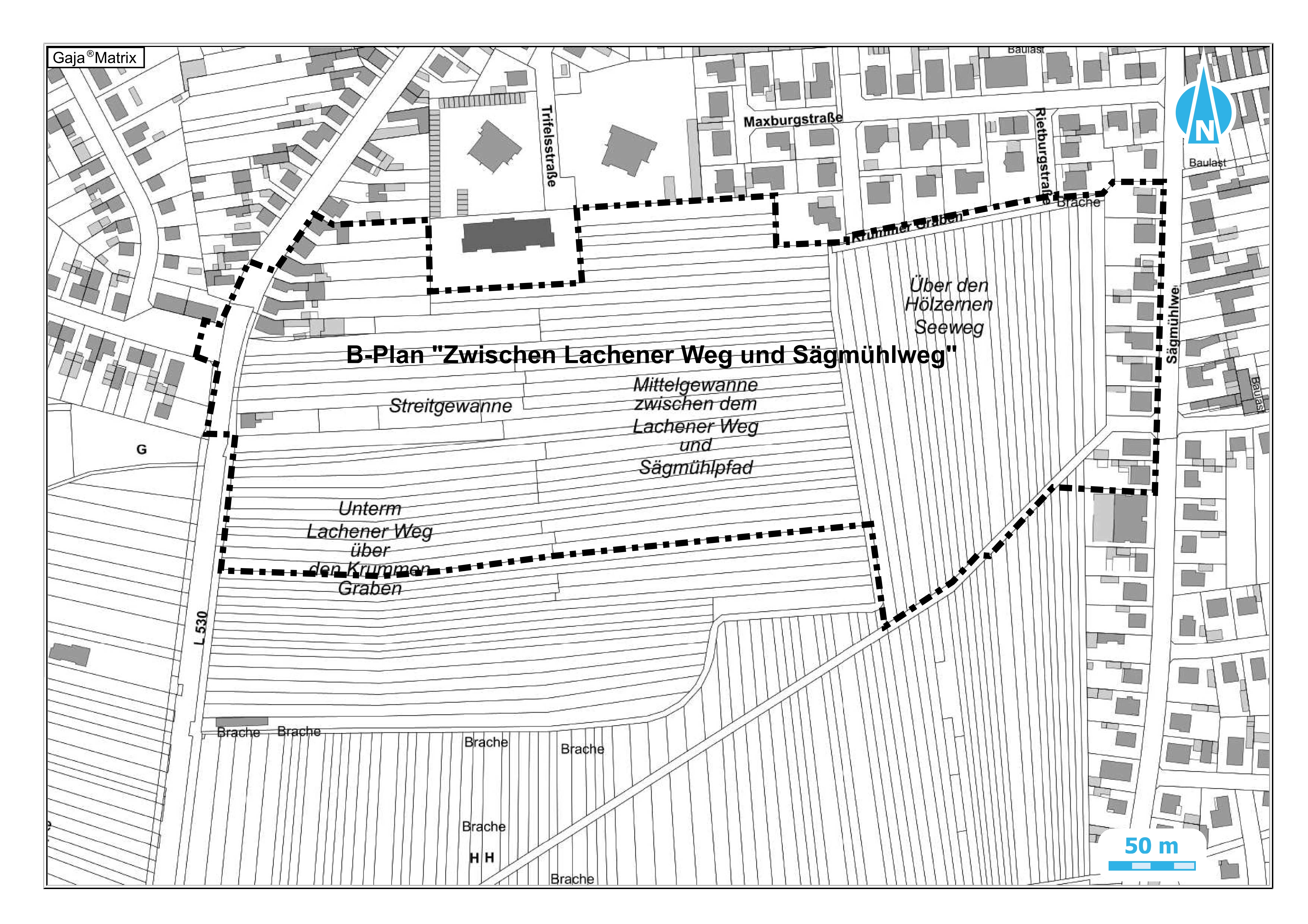 Der Entwurf des Bebauungsplans Nr. 57 „Zwischen Lachener Weg und Sägmühlweg“ mit Begründung und Umweltbericht sowie den nach Einschätzung der Gemeinde wesentlichen, bereits vorliegenden umweltbezogenen Stellungnahmen und ergänzenden Unterlagen wird von